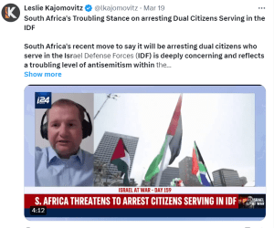 In South Africa’s case, the government has threatened to prosecute citizens or even strip their citizenship for joining the IDF, even if they’re not personally accused of any war crimes, or taking part in anti-terrorist operations. The government is citing local laws it is able to impose on South Africans who join foreign militaries without South Africa’s permission to take part in operations.