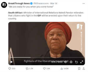 The growing questions about legal consequences for IDF troops who hold other citizenship became a focus due to South African Foreign Minister Naledi Pandor, whose government has accused Israel of genocide in the International Court of Justice. In a speech at a Summit on Palestinian solidarity, Pandor said she was putting South Africans who fight in the IDF ranks on notice.