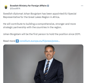 Discussions between Ambassador Borgstam and Rwanda Government officials took place in the framework of his mandate as European Union Special Representative (EUSR) for the Great Lakes region, which include: to support regional mediation and facilitation efforts, such as the Luanda and Nairobi processes and to contribute to building a stronger, comprehensive and more strategic partnership with all the countries in the Great Lakes region, in particular Rwanda, DRC, Burundi and Uganda, to enhance prosperity and security.